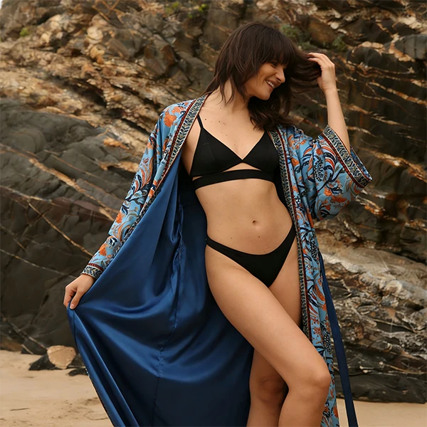 Artisan’s designer silk robe is made of 100% silk and is extremely soft and comfortable to wear. It features Bohemian-style patterns and is perfect for wearing on summer beaches.
