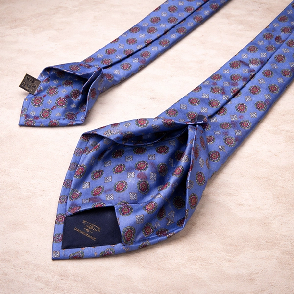 We use a 3-fold construction with a lightweight, resilient wool interlining. This construction provides the necessary body for a clean knot without adding stiffness that could crack the print. The interlining is specifically chosen to allow the printed silk to drape naturally and maintain the integrity of the design.