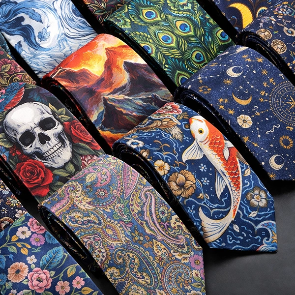 We utilize advanced digital pigment printing technology. This method allows for unlimited colors and photorealistic detail without the cost or minimums associated with traditional screen printing setups. It is ideal for intricate patterns, subtle gradients, and highly detailed artwork, ensuring each tie is a true reproduction of your design.