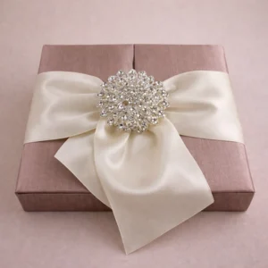 Pale Brown Crystal Brooch Embellished Wedding Invitation BoxesArtisan’s crystal brooch silk box is made from 100% silk, featuring a luxurious design, is a perfect gift box for friends and brides, available with customizing options for colors and logos.